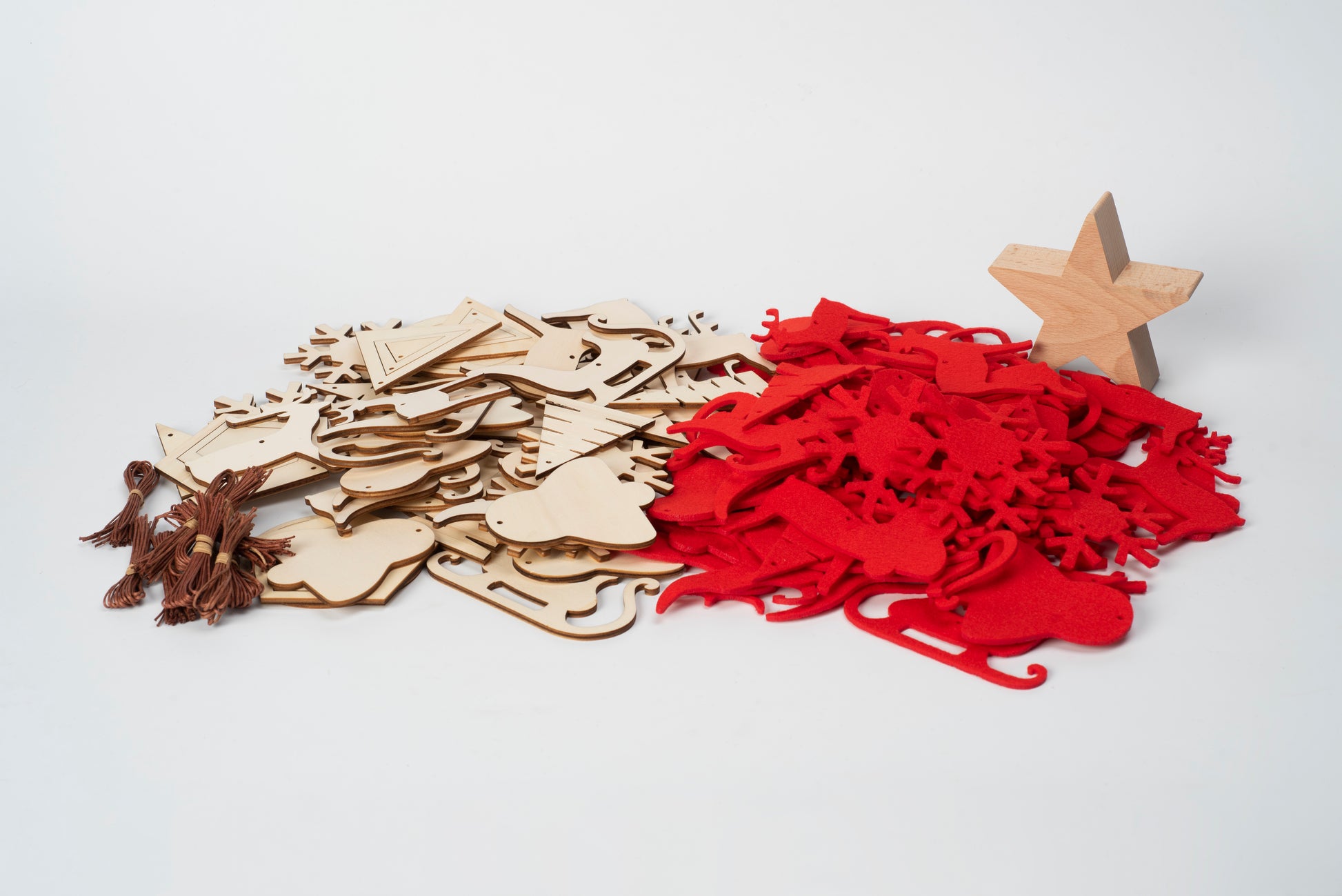 The set includes a wooden star tree-topper and an appropriate number of ornaments made of red felt and wood. Hanging cords are included.